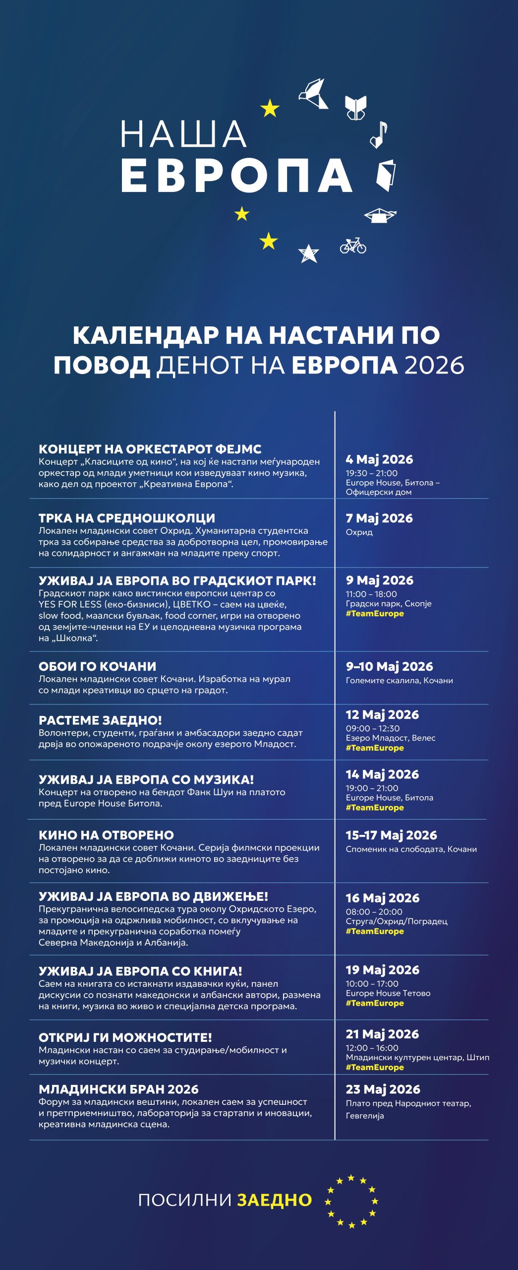 Од музика под отворено небо и младински активизам, до кино проекции, велосипедска тура околу Охридското Езеро и садење 2.500 дрвја, мај ќе се обележи во боите на ЕУ низ целата земја. По повод Денот на Европа, Делегацијата на Европската Унија и Јуроп хаус, заедно со амбасадите на земјите членки на Европската Унија, локалните младински совети и граѓански организации, подготвија програма која прославата ќе ја носи низ паркови, плоштади, културни простори. Од Скопје, Битола и Охрид, до Кочани, Штип, Тетово, Велес и Гевгелија, граѓаните во текот на мај ќе можат да бидат дел од настани кои ќе спојуваат музика, култура, солидарност, природа и младинска активност.
